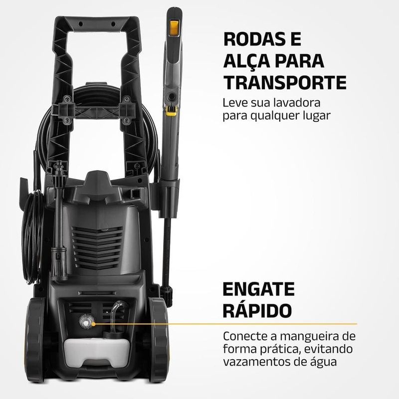 Seu motor de 1.800W garante durabilidade e ótimo desempenho, enquanto o engate rápido facilita a conexão da mangueira, prevenindo vazamentos e otimizando o uso. A lavadora também permite o uso com detergente, facilitando a lavagem de veículos, pisos e áreas com sujeiras engorduradas.