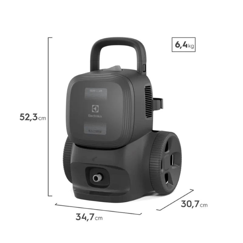 Seu design moderno e robusto também é fácil de transportar, graças à alça retrátil e rodas, que possibilitam maior conforto e ergonomia. Oferece autonomia de uso superior, já que conta com mangueira e cabo elétrico de 5 metros.