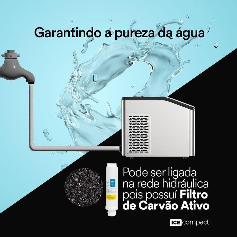 Possui filtro de carvão ativo para que você faça seu gelo sem ter que se preocupar com a fonte d?água