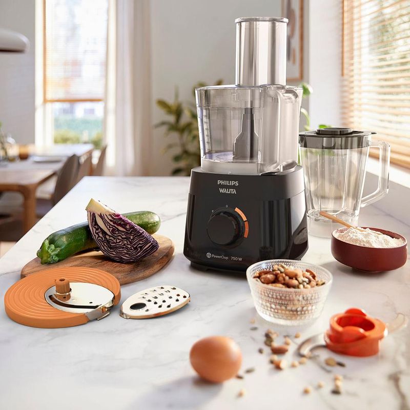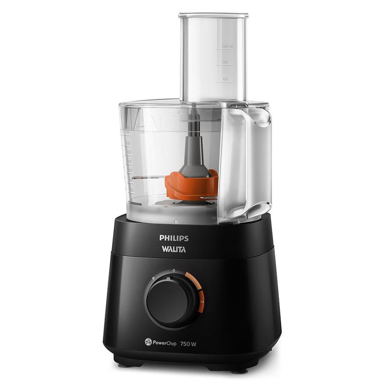 São 750W com 2 velocidades, mais pulsar. Função siga as cores para selecionar a velocidade pela cor dos acessórios, de forma simples e intuitiva! Jarra do Multiprocessador de 1,5L, com tampa medidora. 4 acessórios: Jarra de liquidificador 2L*, Lâmina para ralar, Lâmina para fatiar e Faca processadora PowerChop, exclusiva tecnologia que combina 2 lâminas com ângulos de corte perfeito, muito mais fino e preciso. Assim é possível preparar diversas receitas. Totalmente livre de BPA. Cabo retrátil, compacto e fácil de armazenar. Experimente fazer sempre o seu melhor com Philips Walita!