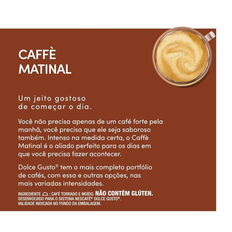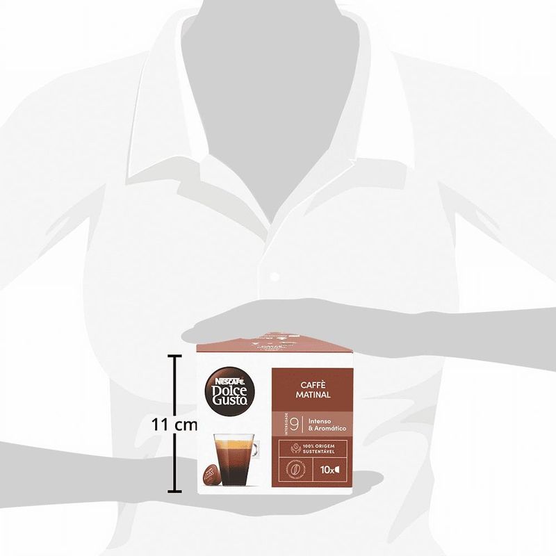 Cada caixa contém 10 cápsulas Caffè Matinal Dolce Gusto, compatíveis com todas as máquinas Dolce Gusto da linha ORIGINAL.