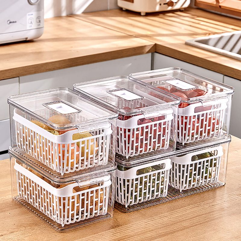 O Organizador com Cesto Dry 6 L é uma caixa organizadora transparente com tampa e cesto que serve para guardar mantimentos frescos na geladeira. É ideal para colocar frutas, legumes e verduras, garantindo que a comida permaneça fresca por mais tempo.