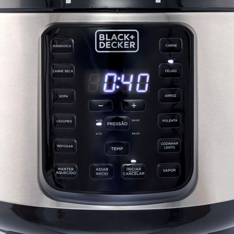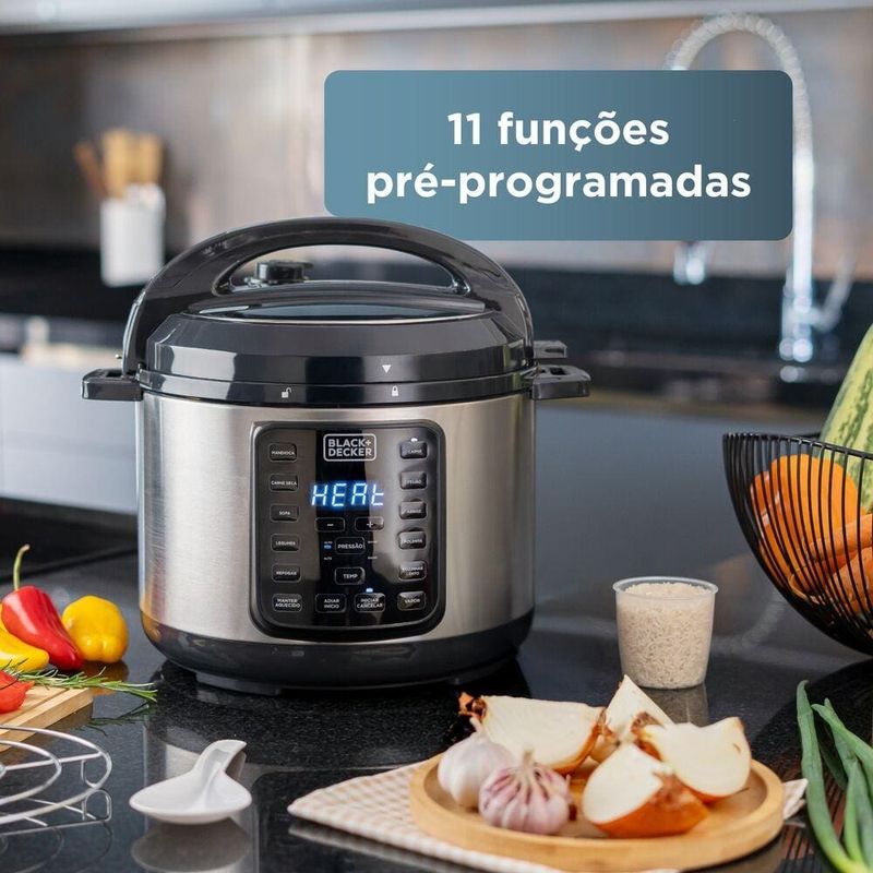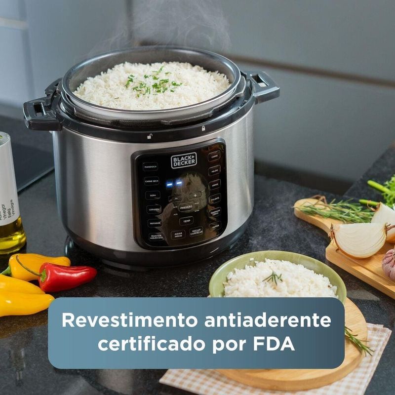A Panela de Pressão Elétrica Black+Decker PP900G Gourmand Gris 5L 900W une design moderno e praticidade para transformar a sua rotina na cozinha. Com capacidade de 5 litros e potência de 900W, ela prepara receitas variadas de forma rápida, segura e saborosa. Multifuncional, permite cozinhar sob pressão, preparar alimentos no vapor, refogar ou até mesmo dourar, garantindo versatilidade no dia a dia. Conta com 11 receitas pré-programadas e a função adiar início, que possibilita programar o preparo conforme sua necessidade.A segurança é um dos destaques do modelo: são 9 dispositivos de proteção, incluindo tampa vedada, botão de travamento e saída controlada de vapor. Além disso, possui aviso sonoro ao finalizar o cozimento e a função manter aquecido, que conserva a temperatura dos alimentos até a hora de servir. O recipiente interno é removível, com revestimento antiaderente certificado pelo FDA, seguro para sua saúde e de fácil limpeza, inclusive compatível com lava-louças. Para maior comodidade, acompanha acessórios práticos: grelha de cozimento a vapor, copo medidor e colher.Capacidade de 5 litros, até 21 xícaras11 receitas pré-programadas + ajustes manuais9 dispositivos de segurança integradosFunção manter aquecido e adiar inícioCertificação INMETRO: UL-OCP-0029Recipiente removível com revestimento antiaderente FDACompatível com lava-louças para facilitar a limpezaCom design sofisticado da linha Gourmand Gris, a Panela de Pressão Elétrica Black+Decker PP900G agiliza o preparo dos alimentos com muita segurança e praticidade. Mude para melhor e facilite sua vida!