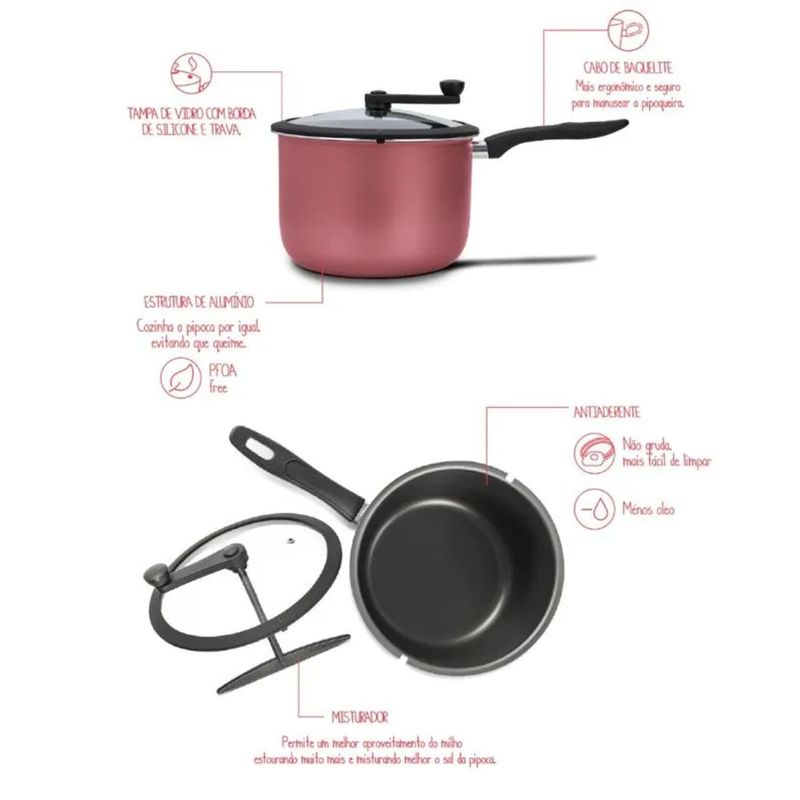A panela tem as seguintes dimensões: 20cm x 14,5 cm - 4,2 litros e capacidade para preparar 70 gramas de milho. A estrutura é de alumínio e possui três saídas para vapor. O cabo e manípulo são produzidos em baquelite antitérmico, não esquentam e proporcionam um toque confortável e ergonômico. A tampa de vidro temperado e saída para vapor e trava oferece maior segurança durante o uso. O misturador em nylon permite melhor aproveitamento do milho e performance, facilita a mistura dos temperos sem riscar a cobertura antiaderente da panela.