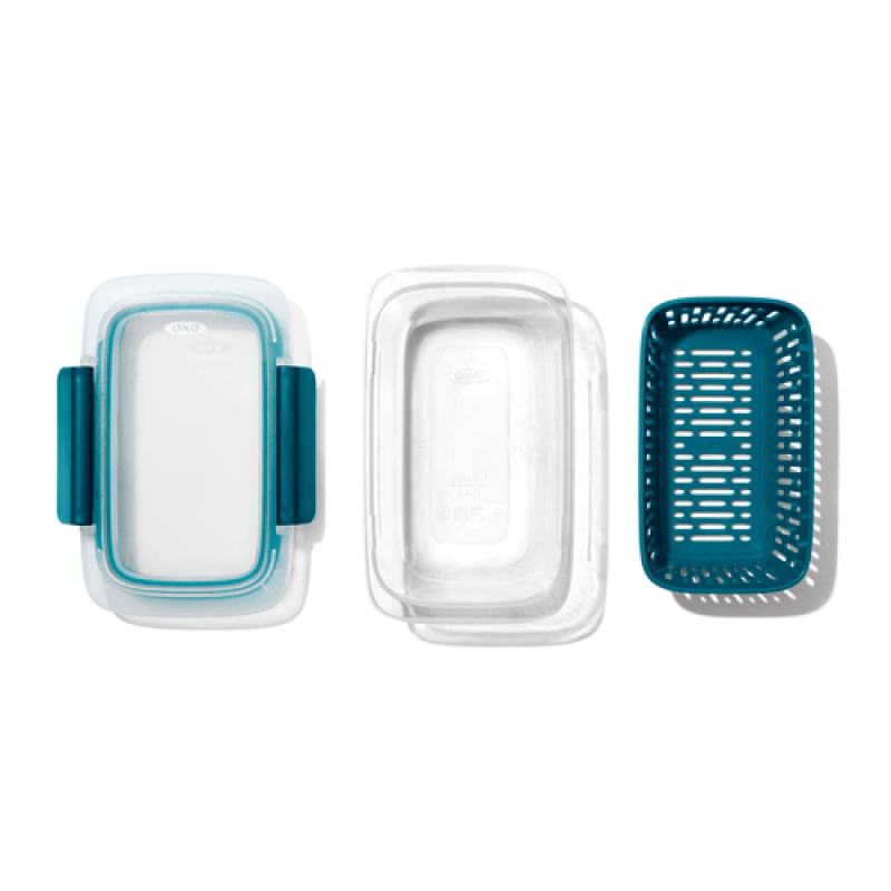 • Enxágue, escorra e armazene frutas ou vegetais em um só recipiente