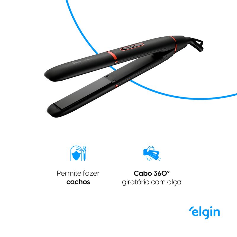 A Prancha Alisadora Elgin Move Liss Preta - Bivolt é para ser utilizada em qualquer lugar, alcança temperatura de até 240°C.