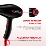 Você busca cabelos bem escovados e no conforto de sua casa? Pode investir no Mondial Turbo Color Red SC-41! Além do design ergonômico e exclusivo, com cabo colorido, o secador possui 1900W de potência. A alta potência proporciona uma secagem rápida e eficiente. Já a Grade cerâmica garante mais proteção aos fios. A grade frontal, por onde sai o ar, tem revestimento cerâmico. Quando a cerâmica é aquecida, libera raios infravermelhos, que penetram nos fios e protegem de danos. O secador Turbo Color Red também possui a Tecnologia Tourmaline Íon. A Tourmaline é um mineral que, ao ser ativado pelo calor, emite íons negativos. Os íons fecham as cutículas dos fios e diminuem a eletricidade estática. O resultado é um cabelo mais macio, brilhoso e sem frizz
