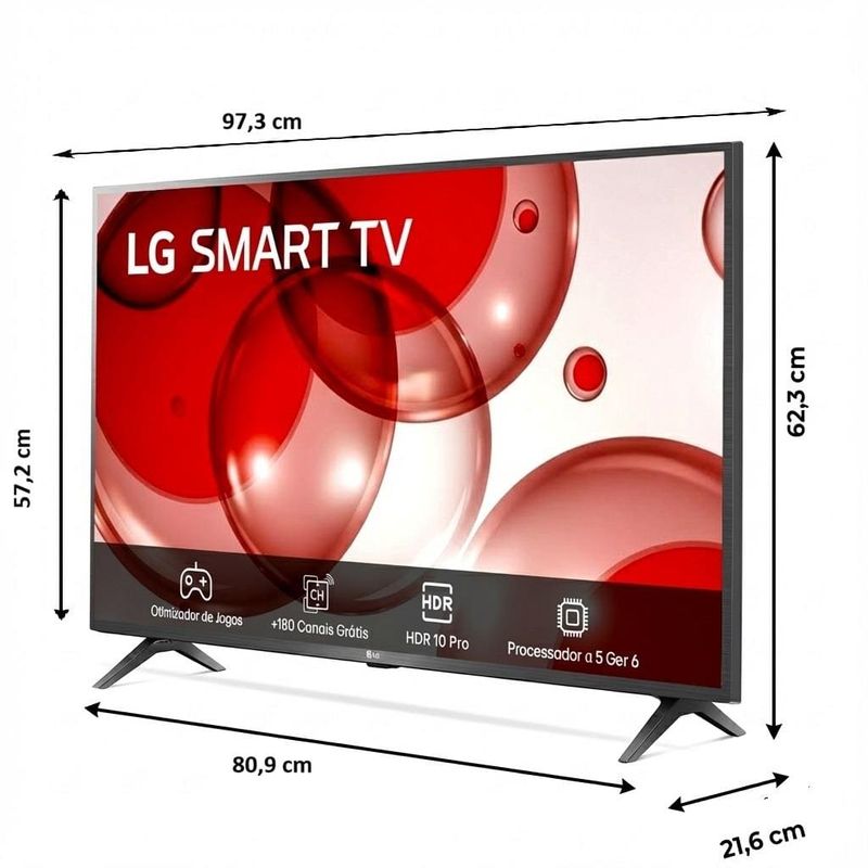 Conectividade sem limites A Smart TV LG 43" Full HD 43LR6700 oferece a flexibilidade que você precisa para conectar múltiplos dispositivos simultaneamente. Assista seus programas favoritos enquanto alterna facilmente entre seu console de videogame, smartphone e computador sem a necessidade de desconectar cabos.Imersão com cores vibrantes e vivasFull HD dá vida às cores naturais. Veja detalhes fantásticos em cada cena em sua Smart TV LG de 43 polegadas. A tela de alta resolução garante uma experiência visual imersiva, onde cada cor é exibida com intensidade e precisão, proporcionando uma qualidade de imagem excepcional.Processador alpha 5 AI Ger 6Vivencie cada momento de forma ainda mais realista com o poderoso processador alpha 5 AI de 6ª geração. Ele otimiza automaticamente o conteúdo exibido, ajustando a nitidez, o contraste e a clareza para que você desfrute de imagens mais vívidas e realistas. Sinta-se dentro da ação com esta tecnologia avançada.Brilho com Inteligência Artificial sob qualquer luminosidadeSeja durante o dia ou à noite, as Configurações de Brilho IA detectam a luminosidade em seu ambiente e ajustam automaticamente o brilho da imagem, proporcionando uma visualização nítida e clara. Desfrute de uma qualidade de imagem consistente e otimizada, independentemente das condições de iluminação ao seu redor.Som Virtual 5.1 canaisSinta a emoção envolvente de um sistema de som surround virtual 5.1 cativante e ouça cada detalhe dos áudios. A Smart TV LG 43" Full HD 43LR6700 oferece uma experiência sonora imersiva que complementa perfeitamente a qualidade de imagem, fazendo com que você se sinta parte da cena.