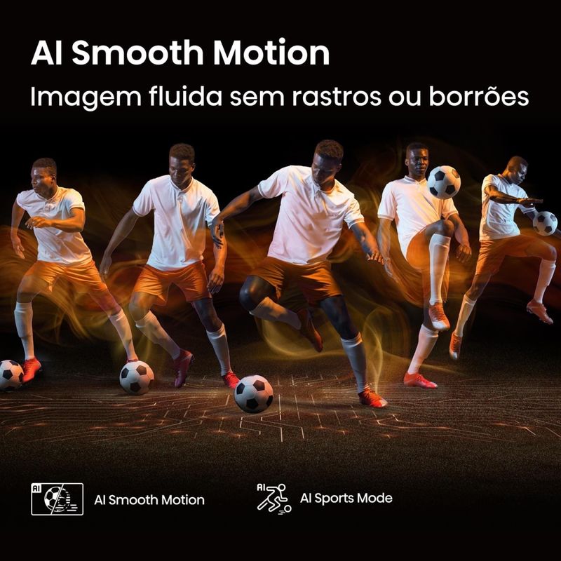Com painel QLED 4K (3840x2160) , a TV oferece cores vivas, brilho de 350 nits e contraste dinâmico de 5000:1. Otimizado com 4K AI Upscaler e AI Smooth Motion, que deixa a imagem fluida sem rastros ou borrões.