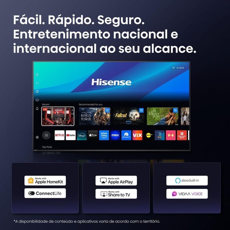 Smart TV 65” Hisense 65U6QV 65Q72QUV ULED MiniLED 4K – A combinação perfeita entre design e tecnologia! A Smart TV 65” Hisense 65U6QV ULED MiniLED 4K oferece recursos inteligentes, tecnologia, conectividade e qualidade de imagem superior e em super tela de 65 polegadas 4k.ULED MiniLED 4KCom painel ULED MiniLED 4K (3840x2160) , a TV oferece cores vivas, brilho de 350 nits e contraste dinâmico de 5000:1. Quantum Dot ColourCom um bilhão de tons de cores vivas, o Quantum Dot Colour oferece uma experiência visual rica, vibrante e realista, garantindo que todas as cores, das mais sutis às mais vibrantes, se destaquem na imagem com clareza e profundidade.Hi-View Ai EngineProcessador de imagem AI que otimiza em tempo real os detalhes de cada cena.HDR10O suporte a HDR10 garante maior profundidade e realismo, enquanto o amplo ângulo de visão de 178° proporciona conforto visual em qualquer posição.Som de 20W e Dolby AtmosO som também impressiona: com potência estéreo de 2x10w e tecnologia Dolby Atmos , a TV cria uma atmosfera envolvente, seja em filmes, séries ou músicas. Compatível com Alexa e Google Home, permite integração com assistentes virtuais para maior praticidade no dia a dia. Vidaa U9Equipada com o sistema operacional Vidaa U9, a navegação é simples e rápida, garantindo acesso aos principais aplicativos de streaming como Netflix, YouTube, Disney+, Prime Video, Apple TV+ e mais. Com conexões completas, possui entradas HDMI, USB, Ethernet, antena RF, áudio/vídeo e saída para fones de ouvido. Tela MiniLED 4K de 65”HDR10 e contraste 5000:1Áudio Estéreo 2x10WCompatível com Alexa e Google HomeDeixe a sua casa ainda mais conectada, conheça outros produtos com a qualidade e tecnologia Hisense!Comprou a TV e não sabe ou não pode instalar, contrate agora mesmo o nosso Serviço de Instalação TV*. Temos profissionais 100% qualificados para instalação de qualquer aparelho em sua casa. Aproveite agora mesmo! *Serviços de Instalação indisponível para compras realizadas no site Extra.com