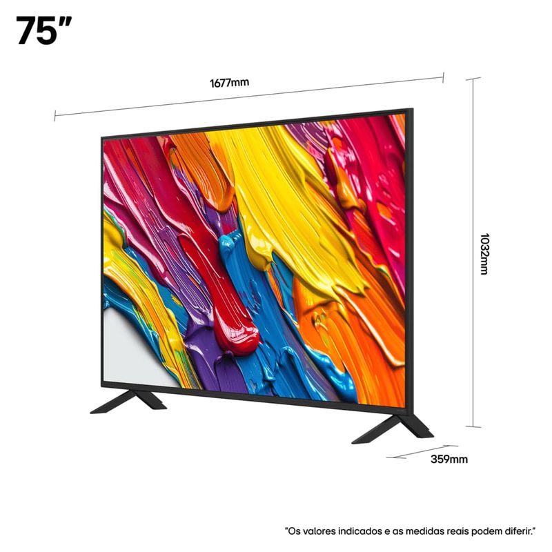 A Smart TV LG QNED 75” 4K 75QNED82ASG entrega uma experiência visual e sonora de alto nível, combinando tecnologias avançadas com design elegante e fino. Com resolução 4K Ultra HD e processador a7 AI de 8ª geração, você tem imagens mais nítidas, vibrantes e realistas. O sistema operacional WebOS 25 traz uma navegação fluida com acesso rápido a aplicativos como Netflix, Amazon Prime Video, Max e Disney+, além de oferecer integração com Alexa para comandos de voz inteligentes. Seu áudio potente com 20W em 2.0 canais é reforçado pela tecnologia Dolby Atmos, garantindo som imersivo para filmes, séries e jogos. A conectividade inclui Wi-Fi 5, Bluetooth 5.0, além de HDMI, USB, saída óptica, entrada RF e Ethernet. Tela plana QNED de 75 PolegadasResolução 4K UHD (3.840 x 2.160)Processador a7 AI Gen8Frequência de 60HzSistema WebOS 25HDR10 com contraste dinâmicoFunção SAPÁudio 2.0 canais com 20W de potênciaDolby Atmos para som tridimensional 3 entradas HDMI1 porta USBEntrada RF, Ethernet, saída óptica e AVWi-Fi 5 e Bluetooth 5.0Controle remoto Smart Magic inclusoCompatível com Alexa Padrão de furação VESA 300x200Bivolt / Tomada 10A – 3 pinosDimensões com base (LxAxP): 1677x1032x359 mmDimensões sem base (LxAxP): 1677x966x52 mmDimensões da base/pé: 25x359mmPeso com base: 31,4 kgPeso sem base: 32,4 kgAnatel: 09460-24-01925Cor: Charcoal BlackCom design Ultra Slim, acabamento em Charcoal Black e suporte VESA 300x200, essa TV se encaixa com elegância em qualquer ambiente.