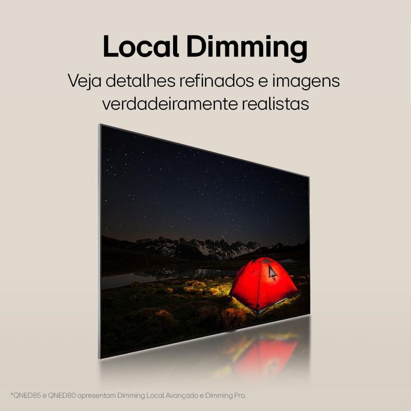 Surpreenda-se com a nova QNEDCores vivas e nitidez impressionante na majestosa LG QNED. O nosso novo processador e o local dimming aprimoram os conteúdos para que cada pixel permaneça extremamente nítido. A tecnologia QNED, uma combinação de Quantum Dot e NanoCell, proporciona uma qualidade de imagem superior, com cores mais precisas e uma profundidade de contraste que traz uma experiência visual deslumbrante. Cada cena ganha vida com detalhes impressionantes e uma vivacidade que transforma qualquer filme, show ou jogo em uma verdadeira obra de arte.Processador AI alpha 8 4KA inteligência extraordinária da QNED eleva a experiência da TV. O Processador AI alpha 8 4K da LG utiliza algoritmos avançados de aprendizado profundo para analisar e otimizar conteúdo, ajustando automaticamente a qualidade de imagem e som para uma performance superior. Este processador poderoso aprimora cada cena, ajustando a nitidez, contraste e saturação para oferecer uma experiência visual e auditiva imersiva e realista.O som ideal para seu ambienteO sistema de som da LG QNED detecta a disposição do ambiente e a posição do ouvinte para criar a melhor configuração de áudio, perfeitamente ajustada à acústica específica do ambiente. Com o som adaptável, você pode desfrutar de um áudio claro e balanceado, independentemente de onde você esteja na sala. Essa tecnologia inovadora garante que você sempre tenha a melhor experiência sonora possível, ajustando-se dinamicamente para proporcionar uma imersão total.Experiência de jogo aprimoradaPara os entusiastas de jogos, a LG QNED é compatível com FreeSync (AMD) e possui o HGIG Mode, além do Otimizador de Jogos. Essas funcionalidades garantem uma jogabilidade suave e responsiva, minimizando o lag e o tearing da tela. O FreeSync sincroniza a taxa de atualização da TV com a taxa de quadros da sua placa gráfica, enquanto o HGIG Mode proporciona uma experiência de jogos HDR mais precisa. O Otimizador de Jogos permite ajustes rápidos e fáceis nas configurações do jogo, proporcionando uma experiência de jogo superior e sem interrupções.