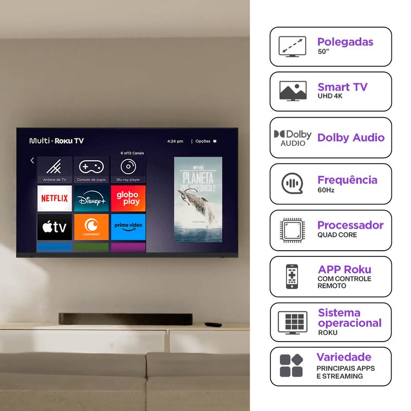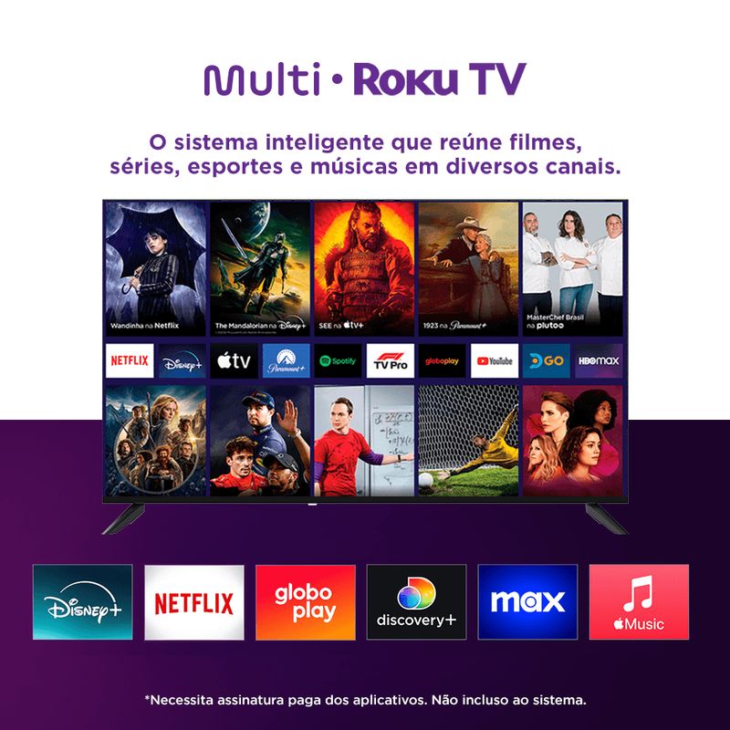 A Multi Roku TV 50 Smart conta com uma enorme tela DLED e resolução 4K HDR para que você não perca nenhum detalhe