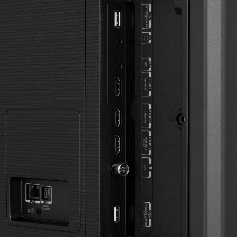 Conectividade Completa: Inclui 3 entradas HDMI 2.0, 2 portas USB 2.0, AV, entrada P2, saída óptica, conversor digital e porta LAN Ethernet, além de Wi-Fi e Bluetooth 5.0 integrados.