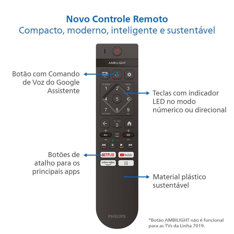 Qualidade de imagem impressionante em 4KA Smart TV Philips 50" 4K 50PUG7019 traz uma experiência visual imersiva com sua resolução Ultra HD 4K. Cada detalhe é exibido com precisão e nitidez, proporcionando cores vibrantes e contrastes profundos. Com uma tela plana de 50 polegadas, você desfruta de uma ampla visão, perfeita para assistir seus filmes, séries e jogos favoritos com qualidade cinematográfica.Google TV com comando de voz integradoCom o sistema Google TV, a navegação é intuitiva e personalizável, permitindo acessar facilmente seus aplicativos de streaming e conteúdos preferidos. O recurso de comando de voz integrado possibilita controlar a TV sem precisar do controle remoto, basta falar para buscar filmes, ajustar o volume ou até controlar outros dispositivos conectados.Conectividade sem complicaçõesA TV Philips 50PUG7019 oferece conectividade via Wi-Fi, garantindo que você se conecte à internet de maneira rápida e estável. Isso facilita o streaming de vídeos em alta resolução, a navegação na web e a conexão de dispositivos inteligentes. Além disso, o suporte para múltiplos formatos de entrada, como HDMI e USB, permite uma integração perfeita com seus aparelhos.Design moderno e funcionalCom um design moderno e minimalista, essa Smart TV complementa qualquer ambiente, trazendo sofisticação e praticidade. A tela plana, além de elegante, oferece uma experiência visual confortável e sem distorções. Essa TV foi projetada para oferecer entretenimento de alta qualidade, unindo tecnologia de ponta e um visual contemporâneo.