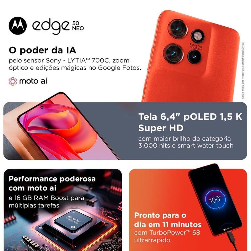 O Smartphone Motorola Edge 50 Neo é alimentado pelo poderoso MediaTek Dimensity 7300 e possui 8GB RAM + 8GB Ram Boost, oferecendo um desempenho excepcional e fluidez para diversas tarefas. Com o eSIM permite a troca de operadoras de forma prática, sem necessidade de chips físicos, embora o dispositivo também tenha uma entrada para chip físico para sua conveniência. Além disso, com a tecnologia RAM Boost, que transforma parte do armazenamento interno em RAM virtual, e uma capacidade de até 256GB de armazenamento interno, você terá amplo espaço para guardar todos os seus arquivos.