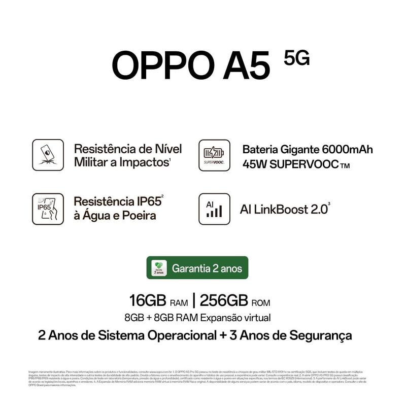 O Smartphone OPPO A5 5G entrega desempenho, autonomia e praticidade no dia a dia. Com design fino, leve e moderno na cor Branco, ele oferece conforto no uso contínuo e visual elegante em qualquer ocasião. Seu processador Mediatek Dimensity 6300 Octa-Core de 2,4GHz aliado à memória RAM de 8GB + 8GB de expansão de memória virtual garante performance fluida para navegar, assistir e se conectar sem travamentos. O armazenamento interno de 256GB oferece espaço de sobra para aplicativos, fotos, vídeos e muito mais. A tela de 6.67” possui tecnologia de ajuste automático torna a experiência ainda mais agradável aos olhos.Capture seus melhores momentos com a câmera traseira dupla de 50MP e 2 MP e a câmera frontal de 8MP. Ambas entregam resultados nítidos para fotos, vídeos e videochamadas. Outro grande diferencial é a bateria de 6000mAh, que permite carregamento rápido de 45W, para quem precisa de rapidez e confiança.Tela de 6,67”Resolução: 1604 x 720 pixelsMediatek Dimensity 6300 Octa-Core de 2,4GHzMemória RAM de 8GB+8GB Expansão Virtual Armazenamento interno de 256GB Sistema Android com interface ColorOS 15Câmera traseira de 50MP e 2MPCâmera frontal de 8MP Dual Chip NanoLeitor de impressão digital lateralSensores: proximidade, acelerômetro, geomagnéticoConectividade: Bluetooth, Wi-Fi, GPSResistência IP65 a Água e PoeiraBateria de 6000mAh com carregamento rápido de até 45WCompleto em conectividade, o OPPO A5 traz Bluetooth, Wi-Fi, GPS e suporte a mensagens SMS, MMS, EMS e e-mail. Os sensores inteligentes incluem proximidade, acelerômetro, impressão digital lateral e indução geomagnética, entregando segurança e praticidade em um só aparelho.