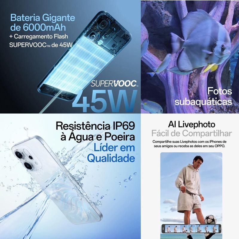 A tela de 6,57 polegadas entrega cores vibrantes e alta resolução, para assistir filmes, jogar ou navegar com conforto visual. A bateria de 6000mAh oferece autonomia de longa duração e conta com carregamento rápido SUPERVOOC de 45W, garantindo energia em poucos minutos. O smartphone ainda possui resistência IP69, trazendo proteção contra água e poeira para você usar em qualquer situação.
