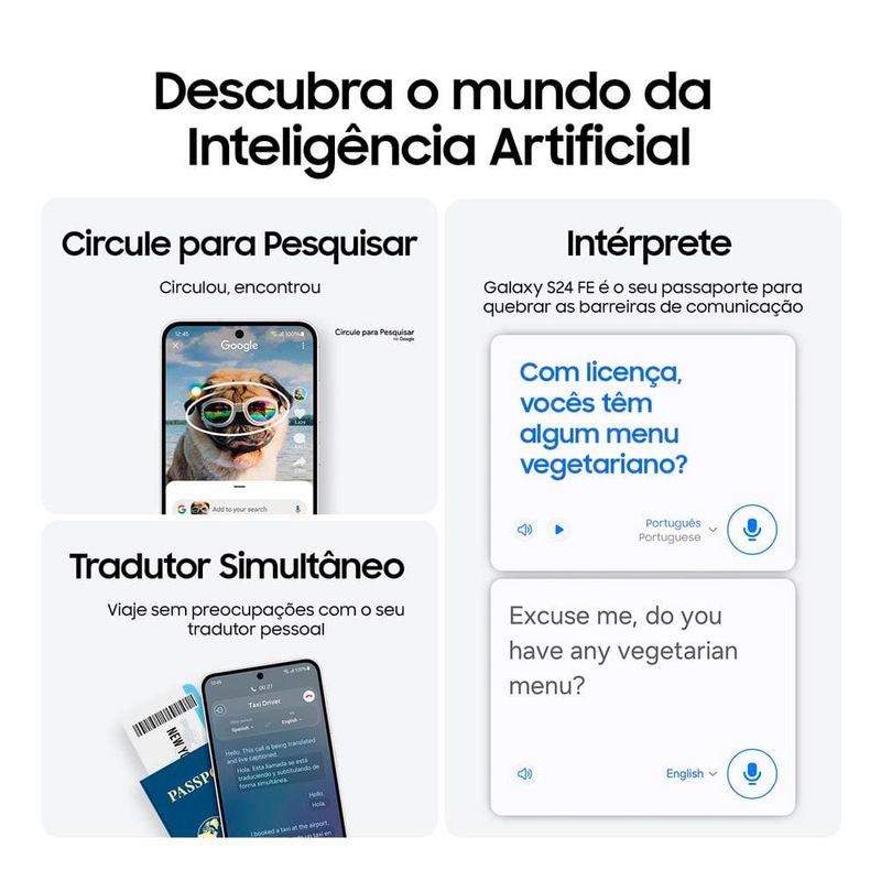 Desempenho e potência para jogos imersivosO Galaxy S24 FE é o smartphone ideal para quem busca desempenho de alto nível. Com o processador Samsung Exynos 2400e, um chip Deca-Core de última geração, o dispositivo oferece uma performance rápida e eficiente. Para quem gosta de jogar no celular, o S24 FE proporciona uma experiência incrível, com gráficos ultrarrealistas e jogabilidade fluída, sem interrupções. Além disso, com 128GB de memória interna e 8GB de RAM, o aparelho garante amplo espaço para jogos, fotos e aplicativos, permitindo um desempenho rápido e sem engasgos, seja em multitarefa ou na execução de aplicativos pesados.Durabilidade e proteção imbatíveisAlém do desempenho, o celular Galaxy S24 FE Grafite se destaca pela sua resistência e durabilidade. O acabamento em alumínio reforçado, juntamente com o vidro Corning Gorilla Victus, garante que o dispositivo resista a impactos e riscos, ideal para o uso diário. Com a certificação IP68, o aparelho é resistente à água e à poeira, permitindo que você o utilize sem preocupações em diversas condições. Seja em um dia de chuva ou ao ar livre, o Galaxy S24 FE oferece a proteção necessária para manter o dispositivo seguro e funcionando.Câmeras de alta qualidade para fotos e vídeos perfeitosCom uma câmera principal de 50MP e uma frontal de 10MP, o Galaxy S24 FE 128GB leva a fotografia a um novo patamar. Mesmo em ambientes com baixa luminosidade, as imagens permanecem nítidas e vibrantes. Além disso, a tecnologia Galaxy AI oferece ferramentas de edição inteligentes, permitindo que você transforme suas fotos com facilidade e de maneira profissional.Tela Imersiva e bateria duradouraA tela Dynamic AMOLED FHD+ de 6.7” do S24 FE proporciona uma experiência visual de alta qualidade, com 1900 nits de brilho, cores vivas e detalhes nítidos. Com uma taxa de atualização de até 120Hz, a navegação e os jogos ficam ainda mais fluídos. E para acompanhar todo esse desempenho, a bateria de 4700mAh garante que você aproveite seu celular por mais tempo, seja assistindo vídeos, jogando ou navegando.