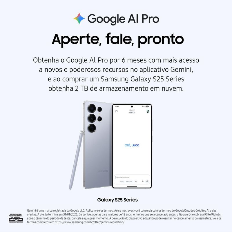 Design moderno e tela imersivaO Samsung Galaxy S25 5G Azul traz um design sofisticado e uma tela de 6,2" com taxa de atualização variável de 1-120Hz, garantindo uma experiência visual suave e agradável. A tela, protegida pelo resistente Gorilla Glass, é ideal para assistir vídeos, jogar e navegar. O smartphone é movido pelo poderoso processador Qualcomm Snapdragon 8 Gen 3 for Galaxy, fabricado em 3nm, que oferece alta performance e eficiência energética, mantendo o dispositivo rápido e com ótimo desempenho.Desempenho superior e inteligência artificialCom 12GB de RAM e 256GB de armazenamento, o celular S25 5G proporciona multitarefas sem lentidão, tornando-o ideal para quem precisa de rapidez e agilidade. A integração com o Galaxy AI proporciona uma interface intuitiva, que não só otimiza o desempenho, mas também garante segurança e privacidade aprimoradas. O dispositivo é capaz de se ajustar automaticamente para proteger seus dados e melhorar a usabilidade, garantindo uma experiência personalizada e eficiente.Câmeras de alta performance para criar e compartilharEste smartphone conta com uma câmera tripla traseira, sendo a principal de até 50MP, que oferece fotos de alta qualidade, mesmo em condições de pouca luz. A capacidade de gravação de vídeos em LOG e recursos como corte automático permitem ajustes criativos e profissionais. Além disso, a redução de ruído otimizada melhora a qualidade das chamadas e gravações, enquanto a função de eliminar áudio pode ser utilizada para remover sons indesejados, proporcionando gravações mais claras e precisas.Conectividade e funcionalidades inteligentesO celular Galaxy S25 5G Azul oferece conectividade avançada com suporte para Dual Chip e eSIM, permitindo o gerenciamento fácil de dois números de telefone. A busca inteligente por imagem, voz ou texto facilita a pesquisa de informações, enquanto comandos de voz realizam múltiplas ações simultaneamente. A tradução simultânea de textos e conversas, além da transcrição e resumo de reuniões ou entrevistas, torna o dispositivo extremamente útil para comunicação rápida e eficiente.Segurança, otimização e desempenho de jogoA segurança do aparelho celular Galaxy S25 AI é reforçada pelo Cadeado Galaxy, um sistema adicional para proteger dados pessoais e informações sensíveis. A interface intuitiva, junto com a otimização de software, garante um desempenho rápido e eficiente, enquanto o sistema de resfriamento avançado mantém o smartphone em temperatura ideal durante o uso intenso. Para os gamers, a jogabilidade é suave e estável, com alta performance em jogos, sem travamentos. O S25 é um dispositivo completo, com alto desempenho, funcionalidades avançadas e segurança aprimorada.