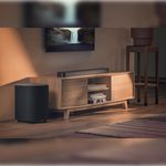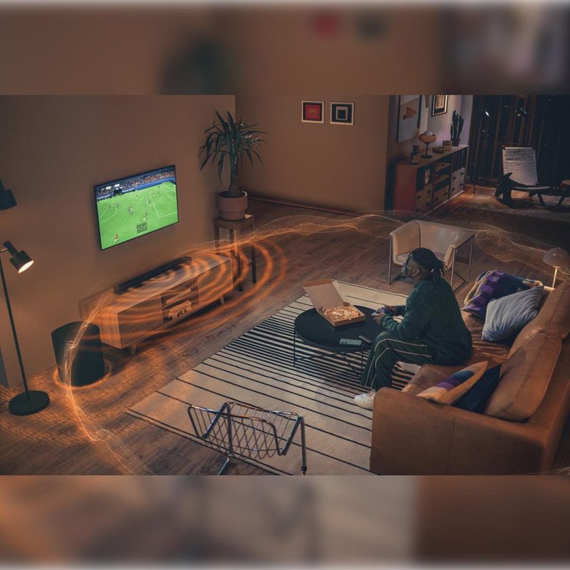 Sistema Poderoso - Com subwoofer sem fio de 10" e caixas traseiras wireless, o sistema entrega graves profundos e impacto sonoro preciso. As tecnologias MultiBeam 3.0™ e Dolby Atmos® criam um som 3D poderoso, sem a necessidade de alto-falantes adicionais.