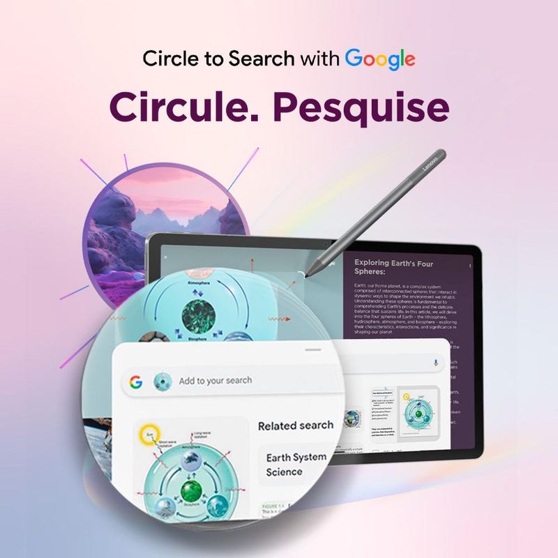 Circule. Pesquise. Descubra um método simplificado para pesquisar em tablets com o Círculo para Pesquisar com o Google. Basta pressionar e segurar o botão home e desenhar um círculo sobre o que você deseja pesquisar usando o dedo ou a Lenovo Tab Pen.