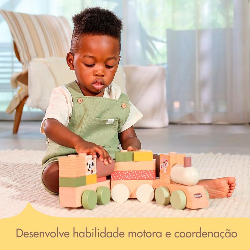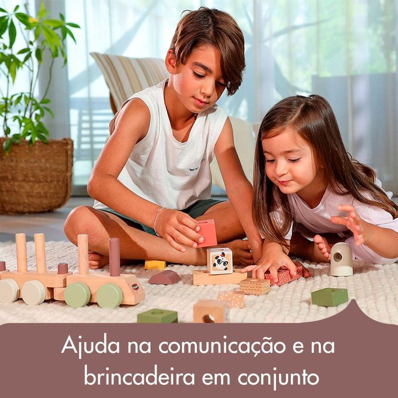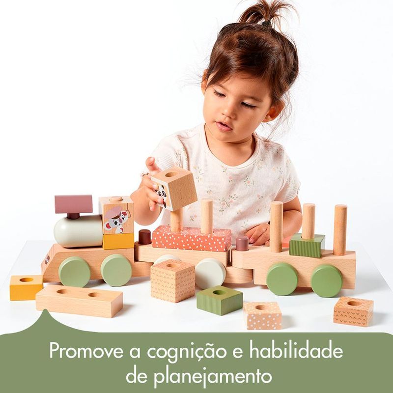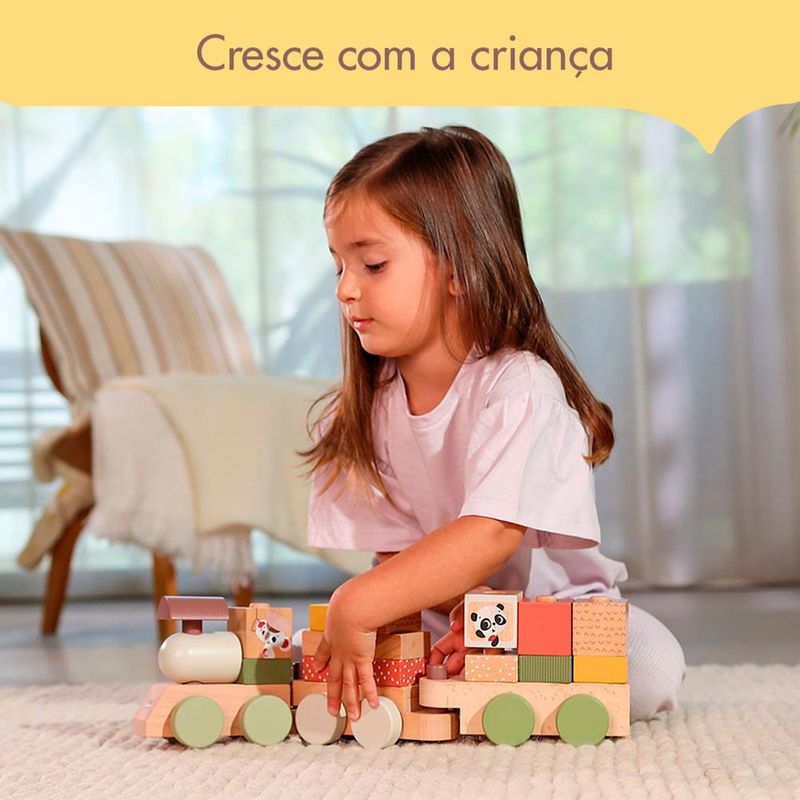 • 3 Vagões Interconectáveis: Os vagões são projetados para serem facilmente conectados, estimulando a criança a explorar diferentes combinações e criar seu próprio trenzinho personalizado.